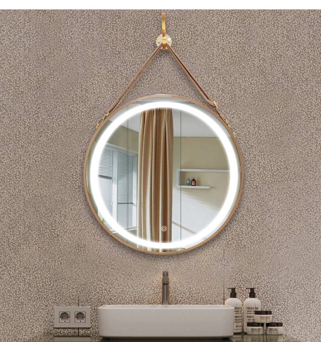 / 제품 / 욕실 거울 / 가죽 스트랩 벨트와 벽 욕실 LED 라운드 미러 스마트 미러 벽 거울 홈 인테리어 블루투스 메이크업 거울 욕실 액세서리 살롱 가구